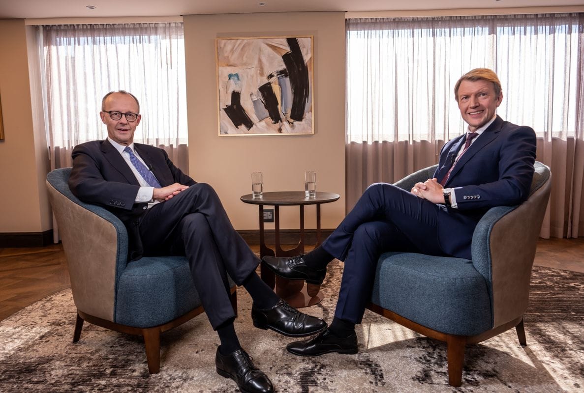 Bundeskanzler Friedrich Merz (l, CDU) wird in Südafrika für die ARD von Markus Preiß interviewt
