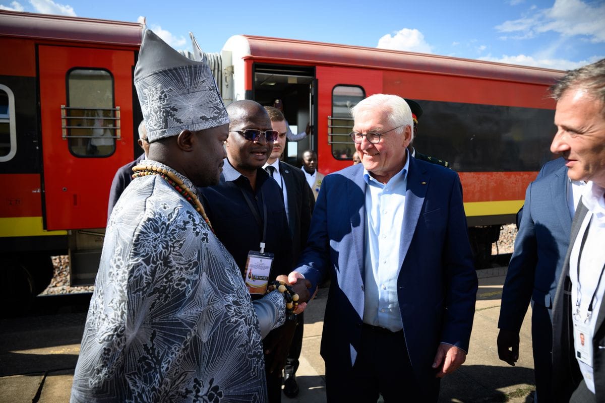 Bundespräsident Frank-Walter Steinmeier wird nach seiner Fahrt vom Bahnhof Huambo mit der Benguela-Bahn entlang des Lobito-Korridors auf dem Bahnhof Caála begrüßt.