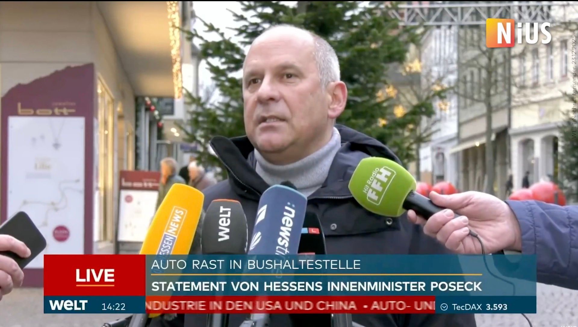Es ist eine Skandal-PK, die Hessens Innenminister Roman Poseck soeben zur Amok-Fahrt in Gießen gegeben hat. Zwei Tage vor Weihnachten fährt ein Aserbaidschaner nahe des Weihnachtsmarkts mit seinem Auto gezielt in andere Wagen, rast dann über den Gehweg, verletzt dabei insgesamt sechs Menschen, einen davon schwer.