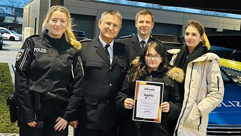 In Stralsund ist die 12-jährige Sophia von der Polizei für ihre Zivilcourage geehrt worden. Das Mädchen hatte am Heinrich-Heine-Ring einen dreijährigen Jungen bemerkt, der sich allein im öffentlichen Raum aufhielt und offenbar unbemerkt von zu Hause weggelaufen war.