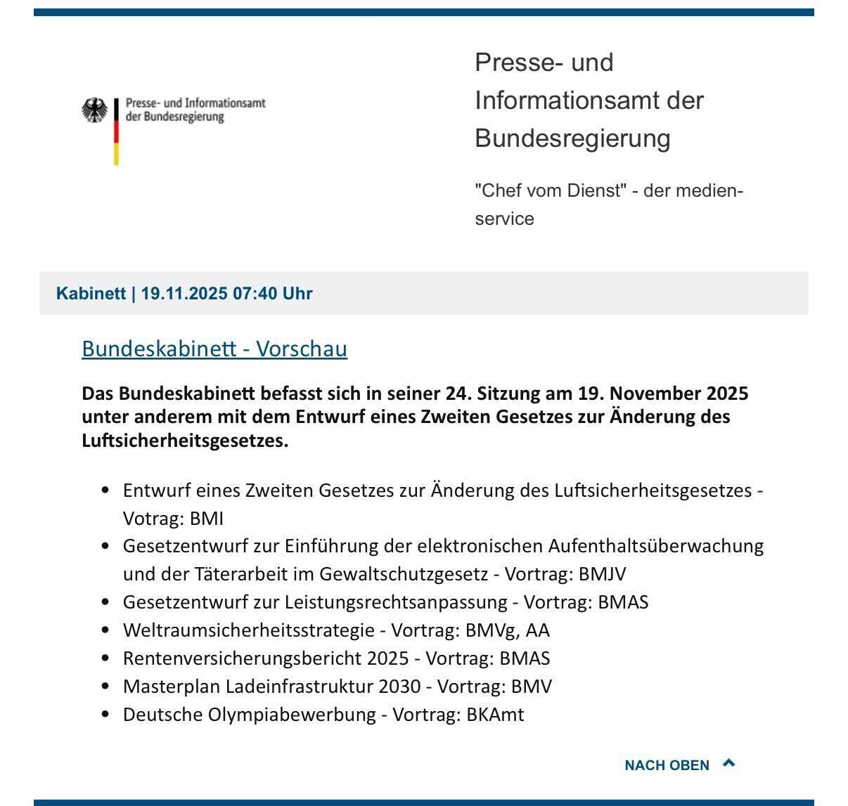 Auf der Tagesordnung des höchsten Regierungsorgans stehen in letzter Zeit immer mehr „Vorträge“ statt Entscheidungen und Beschlussfassungen. An diesem Mittwoch zum Beispiel trug das Bundesinnenministerium zum Luftsicherheitsgesetz vor, das Justizministerium zur elektronischen Fußfessel, das Auswärtige Amt und das Verteidigungsministerium erläuterten die „Weltraumsicherheitsstrategie“ und Arbeitsministerium durfte über den Rentensicherungsbericht referieren.
