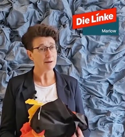 Brüdgam ist die ehemalige Landesvorsitzende der umbenannten SED. Jetzt erklärte sie in einem kurzen Video, sie habe „diese Dinger hier entdecken müssen, die überall aufgehängt waren.“ Gemeint mit „diesen Dingern“ sind schwarz-rot-goldene Nationalfahnen.