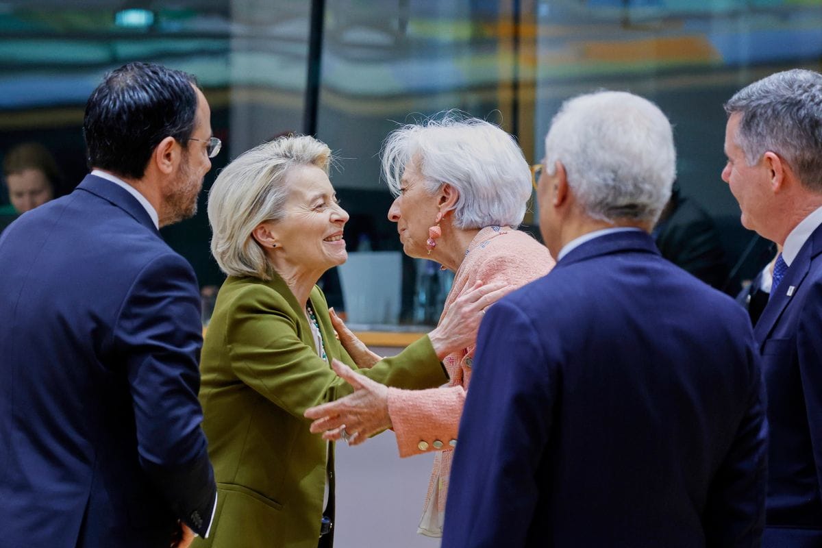 Die Präsidentin der EZB, Christine Lagarde (r) begrüßt die Präsidentin der Europäischen Kommission, Ursula von der Leyen während eines runden Tisches auf einem EU-Gipfel.