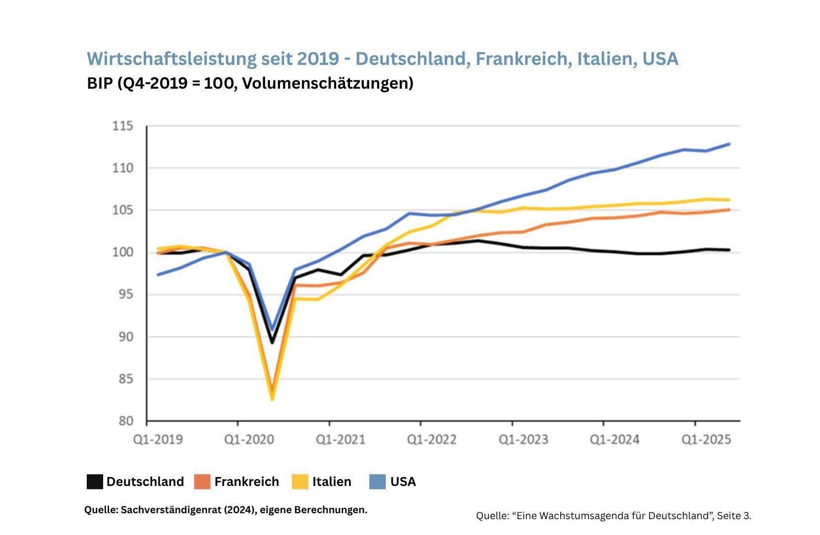 Diese Grafik zeigt, wie sich die deutsche Wirtschaft (schwarze Linie) im Vergleich zu anderen großen Volkswirtschaften entwickelt hat. Während die USA um 12 Prozent, die Italiener um 7 Prozent und die Franzosen um 5 Prozent zugelegt haben, stagniert Deutschland seit sechs Jahren.